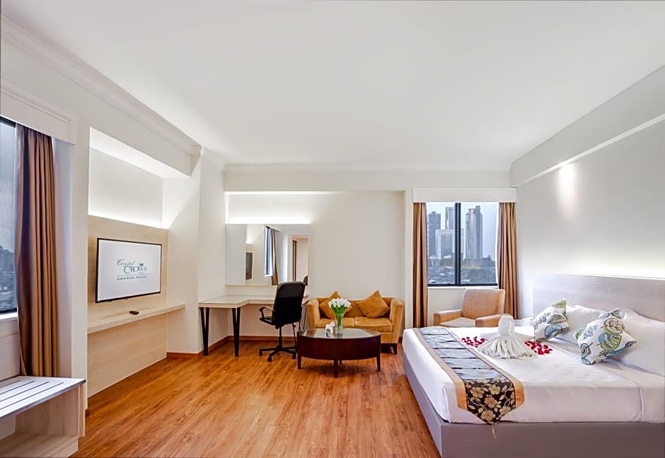 Indulge in the spacious Crown Studio Double or Twin Room, spanning 323 sqft and accommodating 2 adults and 1 child. Enjoy the comfort of 2 twin beds and 1 king size bed, along with luxurious amenities like air conditioning and a private bathtub.