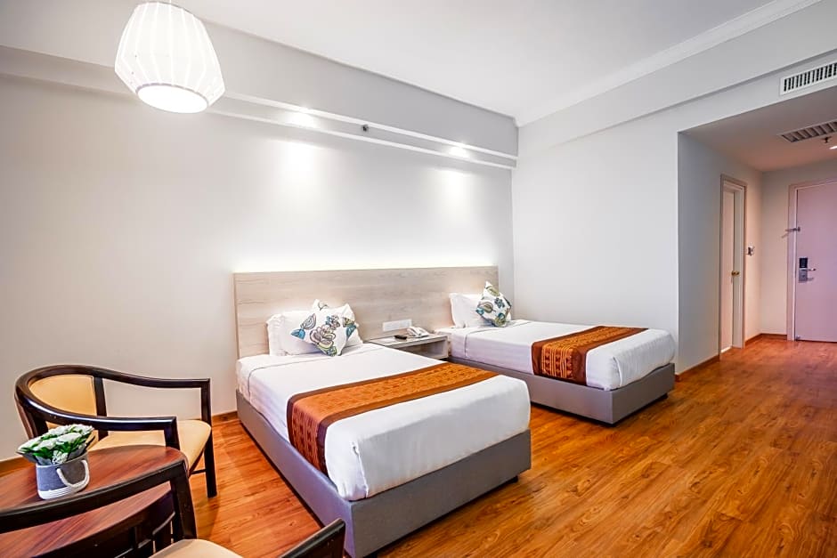 Relax in our spacious 323 sqft Superior Twin Room, featuring two twin beds and one king size bed for 2 adults and 1 child. Enjoy the luxury of air conditioning, a bidet, and a private bathroom with bathtub.
