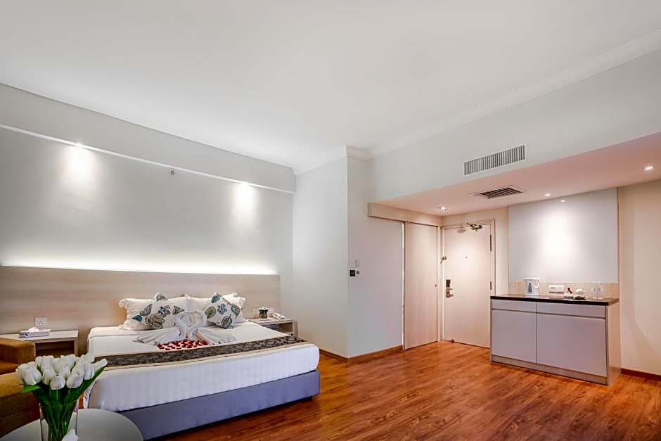 Indulge in luxury with our spacious Executive King Room, featuring a 463 sqft area, a comfortable king size bed, air conditioning and a private bathroom with a bathtub and bidet. Perfect for 2 adults and 1 child, this room is a haven of comfort and elegance.